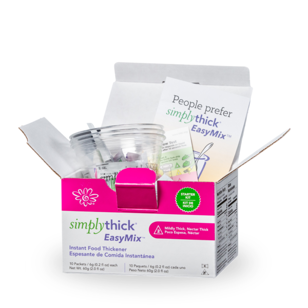 SimplyThick® EasyMix™ gel thickener consists of: Water, acacia gum, xanthan gum, Glucono delta-lactone, gellan gum, potassium sorbate, calcium chloride, citric acid, sodium citrate, guar gum, and pectin.